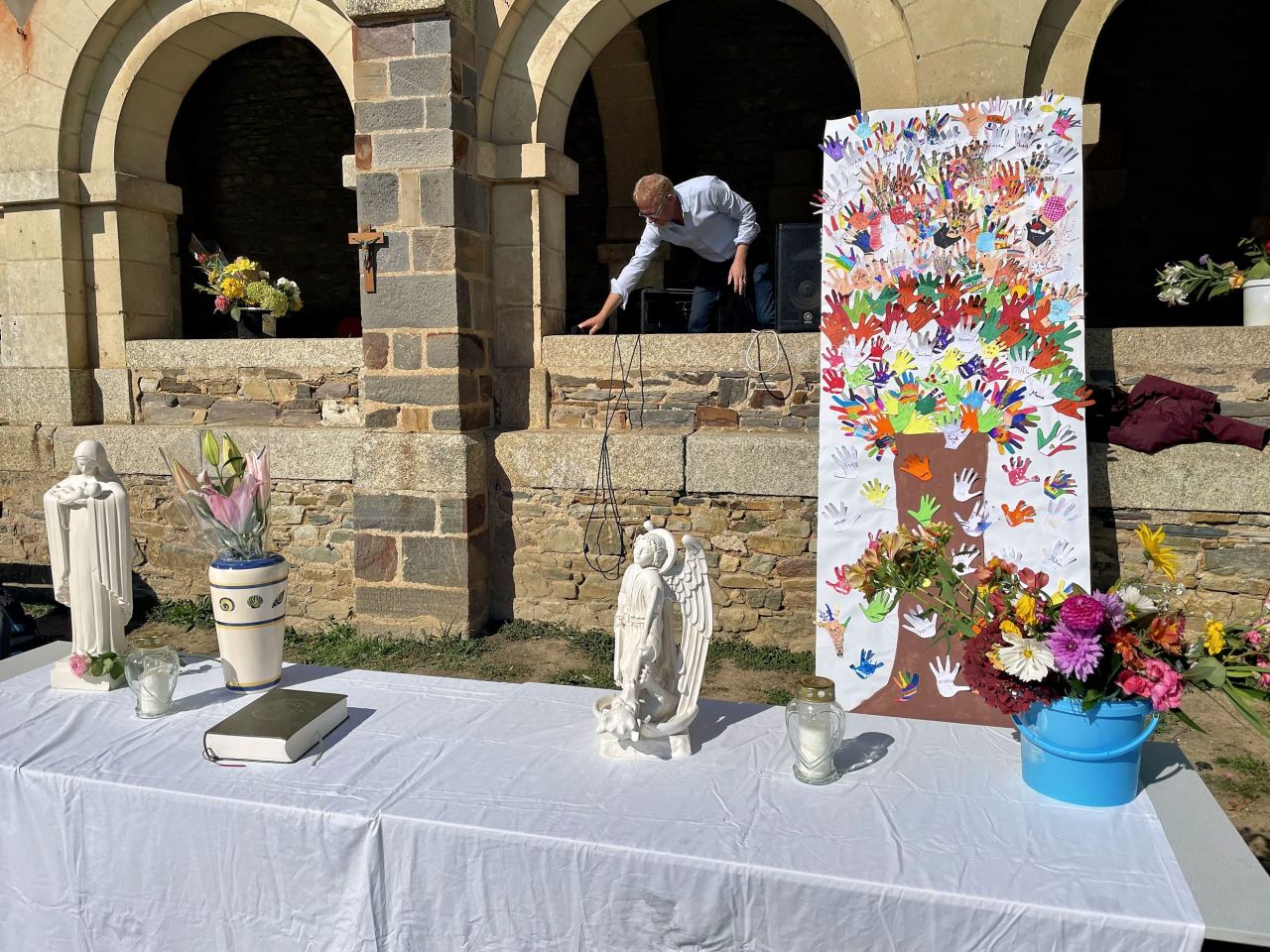 A l'issue de cette après-midi, a eu lieu notre célébration de la Saint Michel. Tous les élèves de la maternelle au CM2 se sont rassemblés avec une fleur à la main, sur la cour de l’école élémentaire.